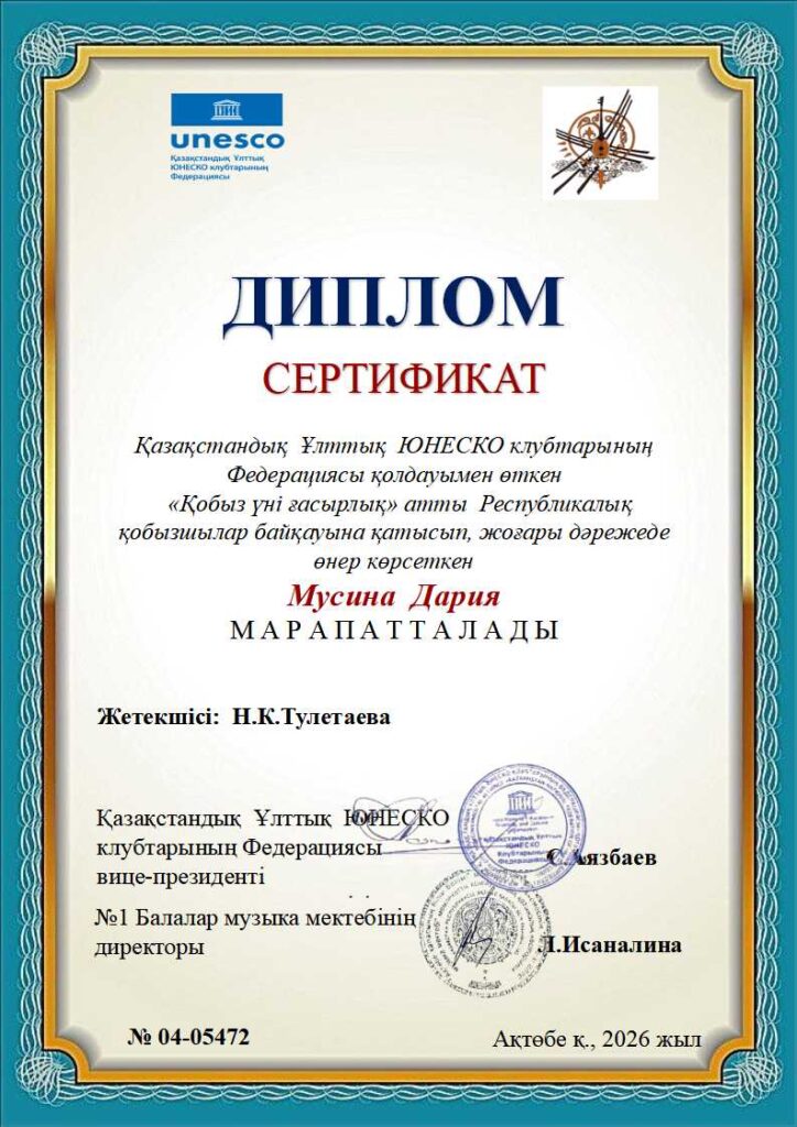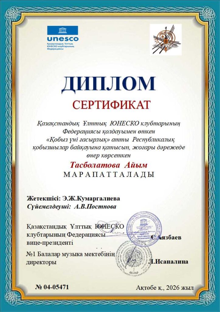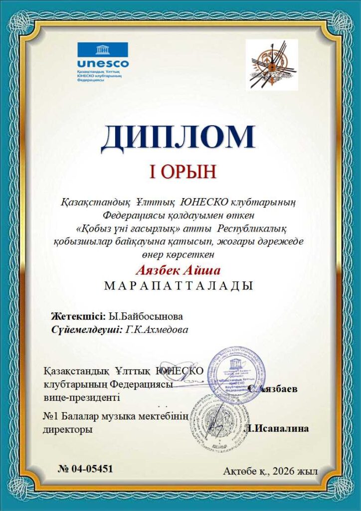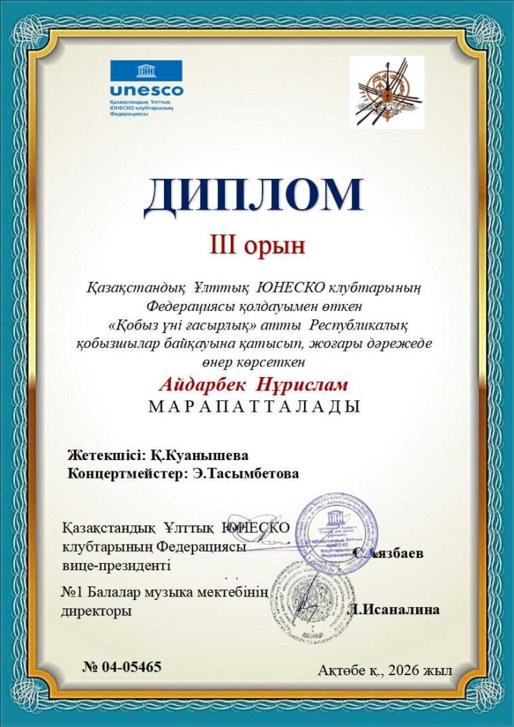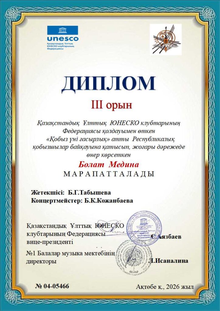 «Қобыз үні ғасырлық» Республикалық байқауының дипломдары КІШІ ТОП