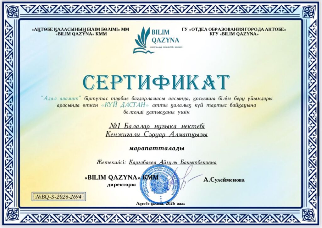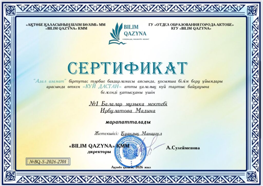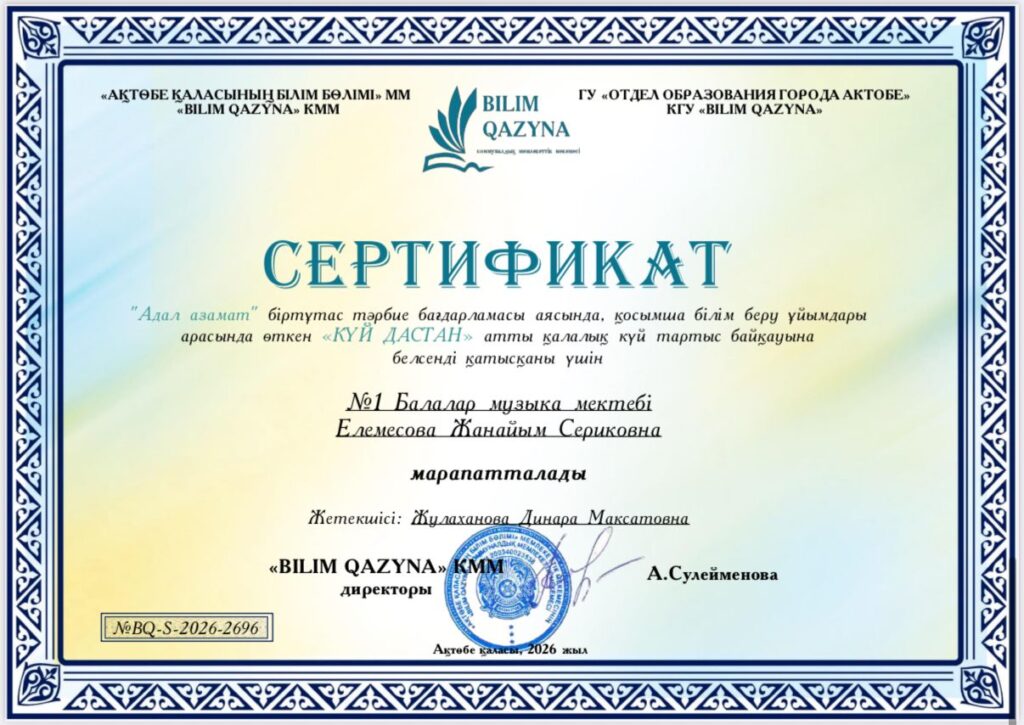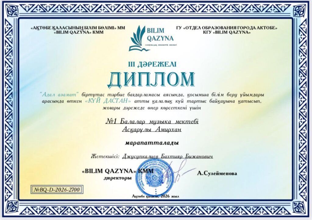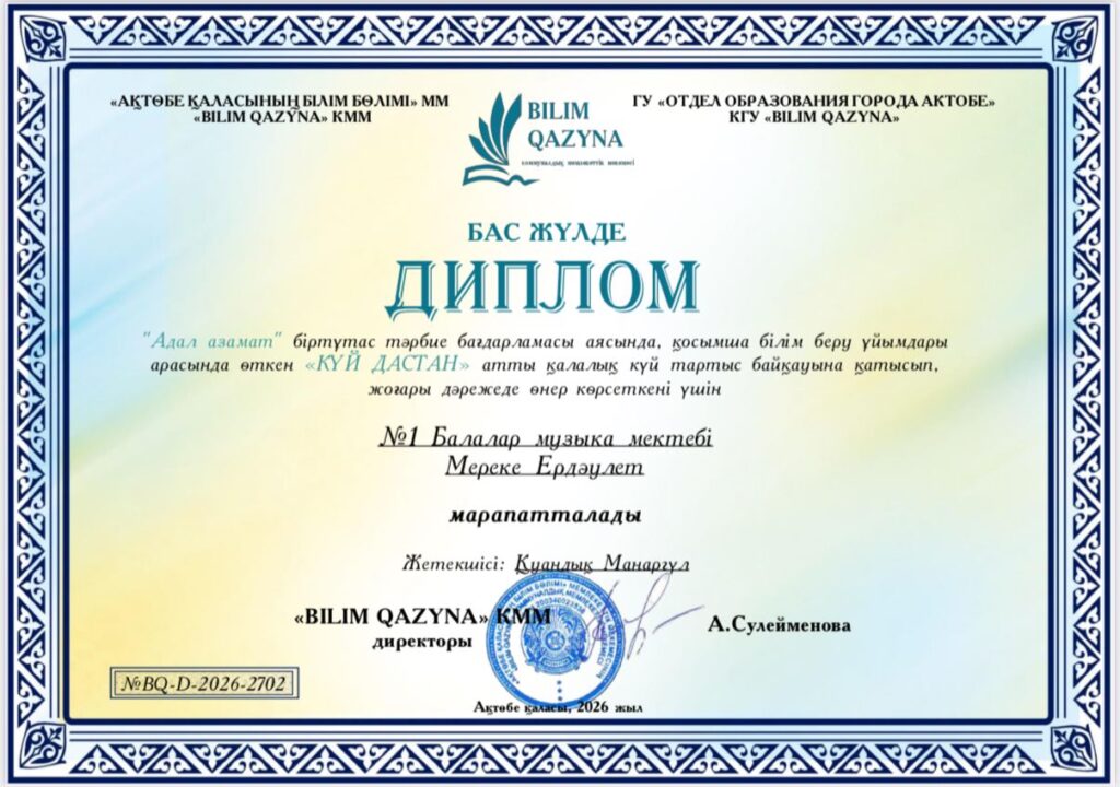 26.03.2026 ж. «КҮЙ ДАСТАН» атты қалалық күй тартыс байқауының дипломдары