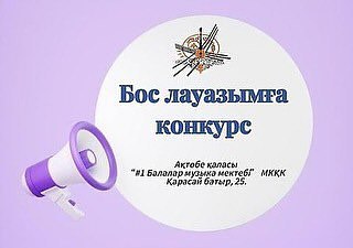 #1 Балалар музыка мектебі педагогті конкурстық негізде жұмысқа қабылдау Қазақстан Республикасы Оқу-ағарту министрінің 2025 жылғы 31 наурыздағы № 57 және Қазақстан Республикасы Еңбек және халықты әлеуметтік қорғау министрінің 2025 жылғы 31 наурыздағы № 96 бірлескен бұйрығына сәйкес жүргізіледі.