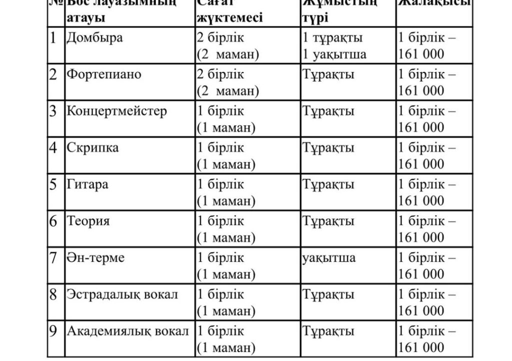 #1 Балалар музыка мектебі педагогті конкурстық негізде жұмысқа қабылдау Қазақстан Республикасы Оқу-ағарту министрінің 2025 жылғы 31 наурыздағы № 57 және Қазақстан Республикасы Еңбек және халықты әлеуметтік қорғау министрінің 2025 жылғы 31 наурыздағы № 96 бірлескен бұйрығына сәйкес жүргізіледі.
