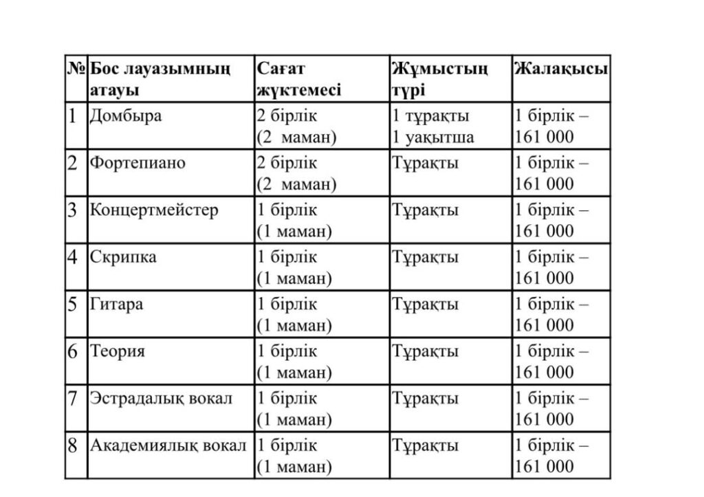 #1 Балалар музыка мектебі педагогті конкурстық негізде жұмысқа қабылдау Қазақстан Республикасы Оқу-ағарту министрінің 2025 жылғы 31 наурыздағы № 57 және Қазақстан Республикасы Еңбек және халықты әлеуметтік қорғау министрінің 2025 жылғы 31 наурыздағы № 96 бірлескен бұйрығына сәйкес жүргізіледі.
